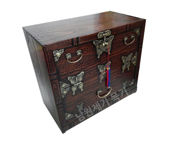 • 윗면, 좌우 옆면, 밑면과 나비 문양이 장식된 앞면과 문짝까지도 두꺼운 오동나무로 되어 있으며, 뒷면은 합판이나 제품의 내구성을 위하여 칠이 되어 있어 습에도 강합니다. 이 처럼 보기에는 싸구려 저가형과 비슷하게 보이지만 꼼꼼이 따져 보면 제품의 질이나 품격에 있어 확연히 다르다는 것을 느끼실 수 있습니다.